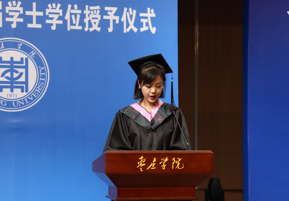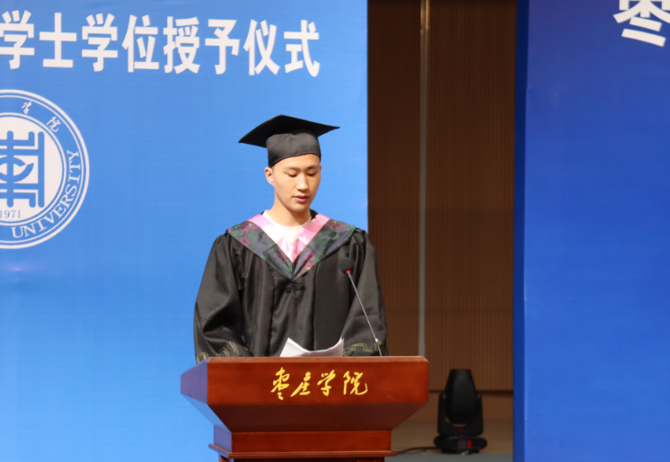 原学生会主席、大学生艺术团团长朱方晓带领全体毕业生宣誓,将秉持诚信与勤奋,追求知识与真理。不忘初心、牢记使命,兼爱尚贤,博物戴行,厚德明道,敬慎固本,将以实际行动,为母校争光,为国家发展贡献力量,为实现个人价值而不懈奋斗!誓词铿锵,是青春的力量,是对未来的向往!