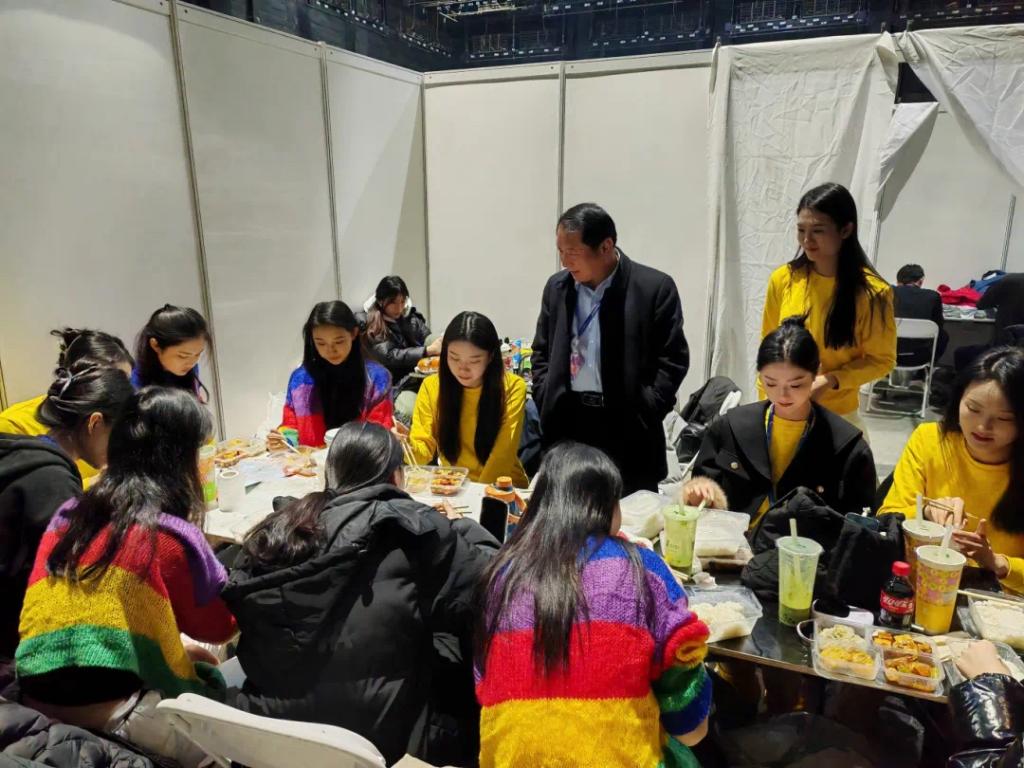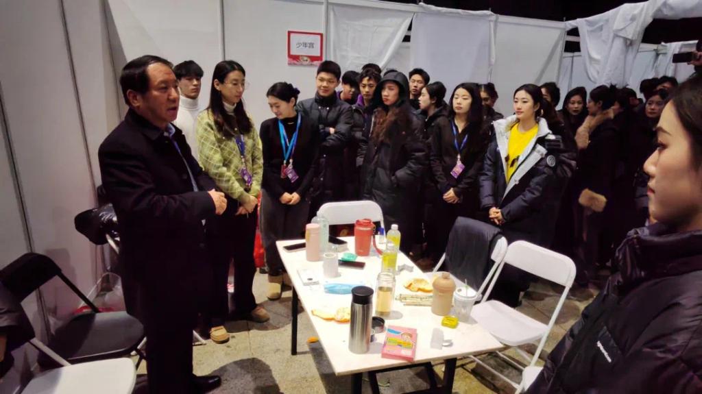 在山青院进行排练时,石硕、顾潇、马体亚、三位老师不辞辛劳,一直陪伴着我院学生进行学习与训练,在北京卫视集中彩排期间,沙雪晗老师全程陪同并带病坚持,为学生保驾护航,树立了爱生如子的感人标杆。太阳网集团tcy8722党总支书记李永教授专程前往北京看望参演学生,为演出学生加油鼓劲,并代表太阳集团tcy8722党委高峰书记为她们送去太阳集团tcy8722的温暖慰问和美好祝福,为每一位学生都送上了水果和牛奶,与学子畅聊,鼓励他们坚持不懈,把握珍贵机会,演绎精彩人生,并全程在后台切身感受学生的用餐、排练与现场演出,并与学生合影留念。