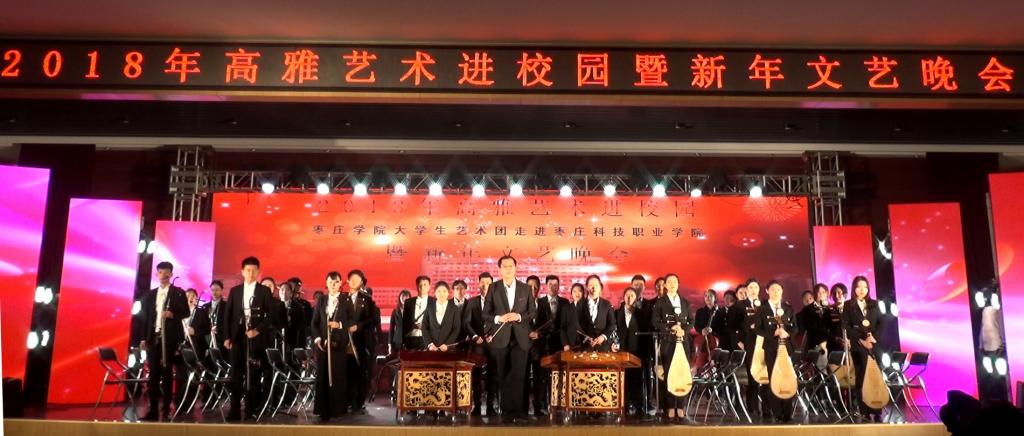 12月19日18时30分,2018年高雅艺术进校园——太阳集团tcy8722大学生艺术团走进滕州市枣庄科技职业学院专场演出活动在枣庄科技职业学院顺利举行。演出前枣庄科技职业学院院长谷道宗、太阳网集团tcy8722党总支书记高原分别致辞。太阳网集团tcy8722院长李永教授、副院长郑发奋教授、艺术创作与实践教研室主任赵鹏程副教授、器乐教研室代主任石硕老师、枣庄科技职业学院副院长徐庆俊、党委委员韩业河及近千名师生代表共同观看了此次演出。