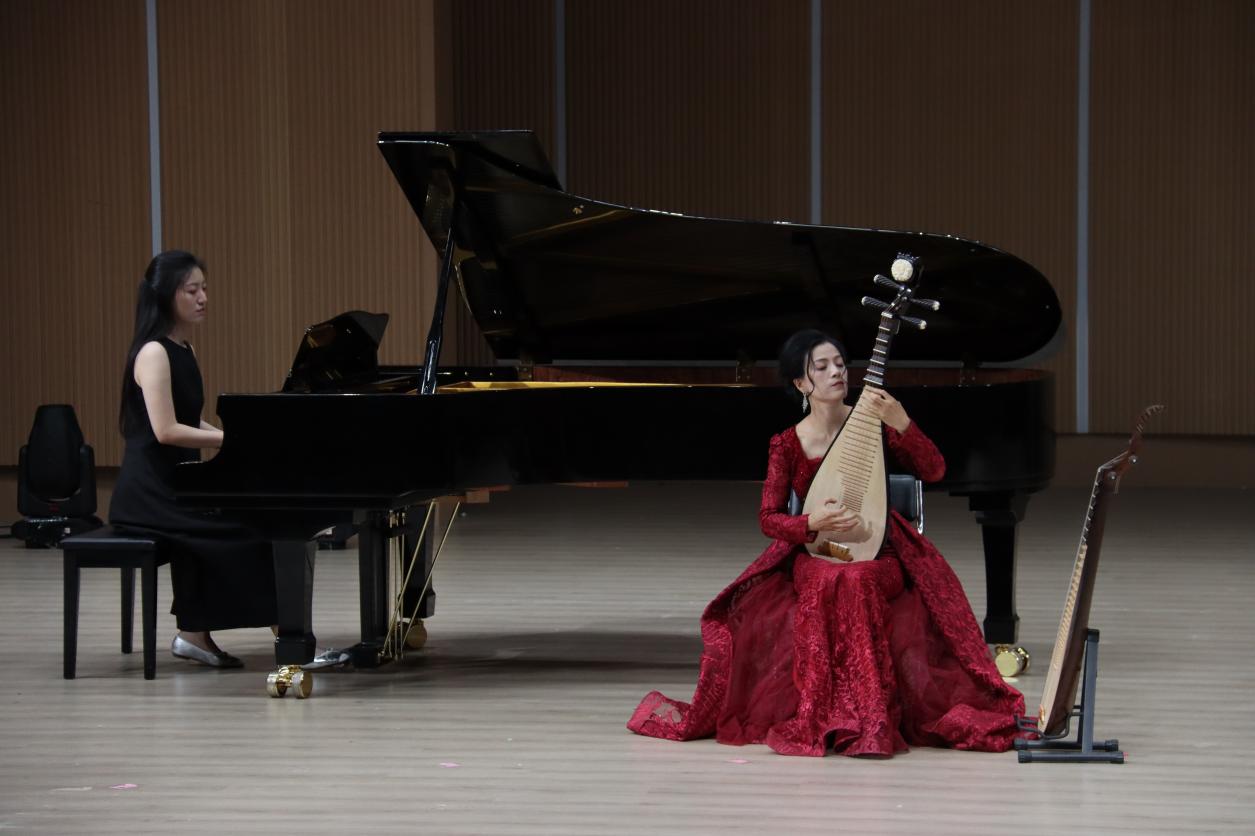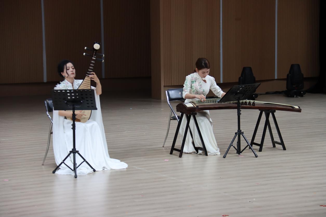 作品《天鹅》旋律悠扬,如优雅天鹅起舞,营造出静谧美好的意境。《春江花月夜》以音符勾勒出一幅流动的江南画卷,令人陶醉。与孙晓彤等老师联袂呈现的合奏版《梦入江南》,巧妙融合琵琶婉约音色与江南风情,技艺与情感交织,将观众带入烟雨朦胧的江南小巷。奚淑婷、彭山、孙晓彤老师及优秀学生带来的民乐合奏《江南风韵》凸显了江南水乡的温婉秀丽,充分展示了我院师生的演奏水平。《龟兹舞曲》带领观众领略了西域古国的热烈风情。《江南三月》以明快灵动的旋律,生动描绘了江南春天的盎然生机。最后,周婷婷与赵文聪两位老师联袂献上《云想花想》。两人默契十足,琵琶的音色与钢琴交相辉映,将情感层层推进至高潮,现场气氛热烈,为整场演出画上圆满句号。