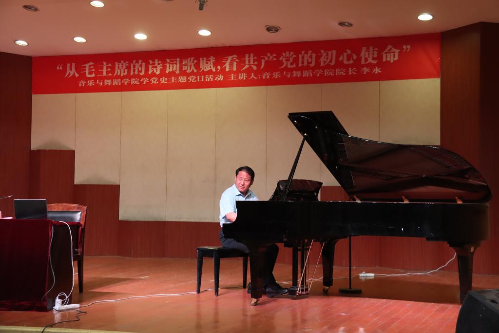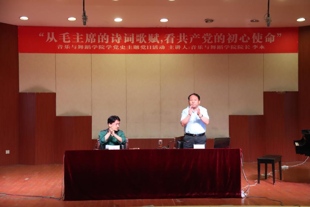 李永院长首先以自己做的词《感党恩·抒怀》作为党课的开篇,然后介绍了毛主席的生平以及在党内、军内和国家担任的职务,讲述了毛主席为国家为人民创下的丰功伟绩,歌颂了毛主席夙夜为公、鞠躬尽瘁,一心为民的革命精神。党课第二部分,李永院长选取了33首毛主席创作的经典诗词进行讲述,讲述了革命年代的红色背景,讴歌了革命伟人为了人民抛头颅洒热血的奉献精神,并现场演奏了钢琴曲《七律·长征》,现场声乐老师与学生合唱,余音环绕,荡气回肠。讲到高潮时,李永院长还声情并茂的配乐朗诵了《沁园春·雪》,表达了对毛主席,对共产党的崇敬之情。党课第三部分,李永院长结合毛主席诗词和共产党的大政方针、政策、口号等阐述了中国共产党的初心和使命,全体听课人员备受鼓舞,即学到了党史知识,又提升了党性修养,全场掌声不断,久久不停。