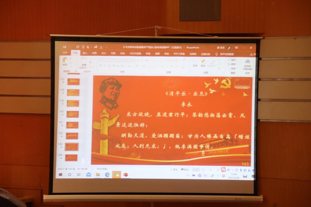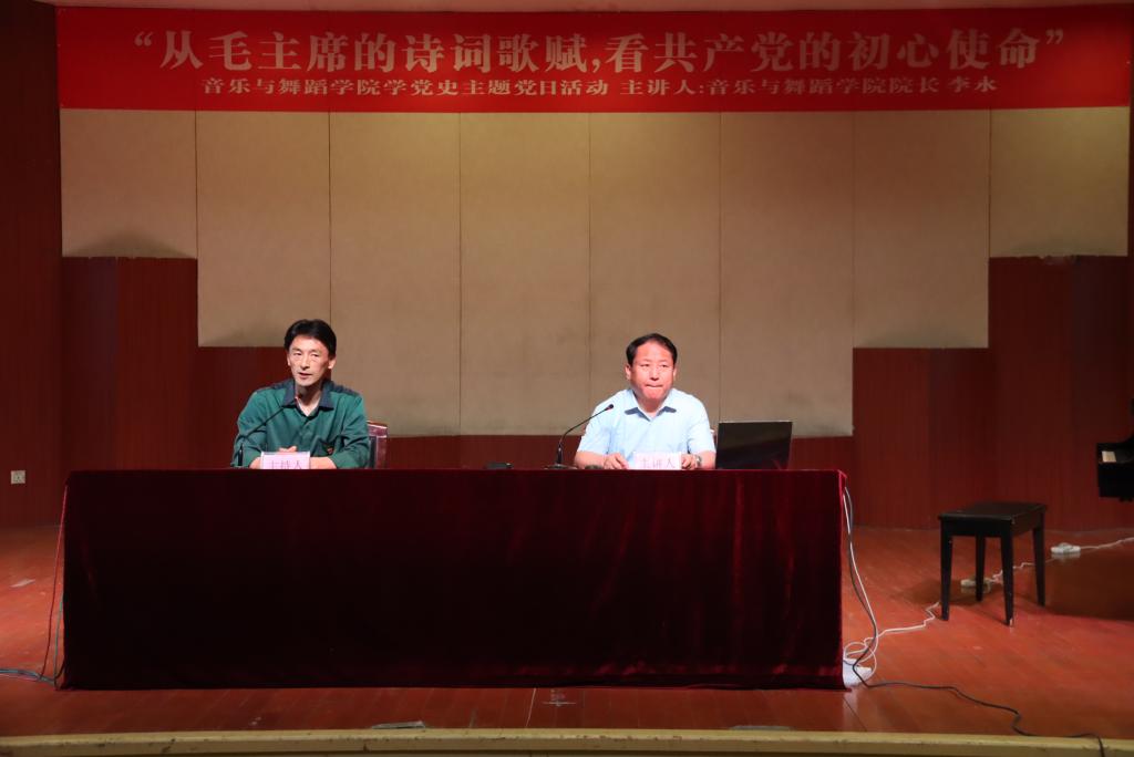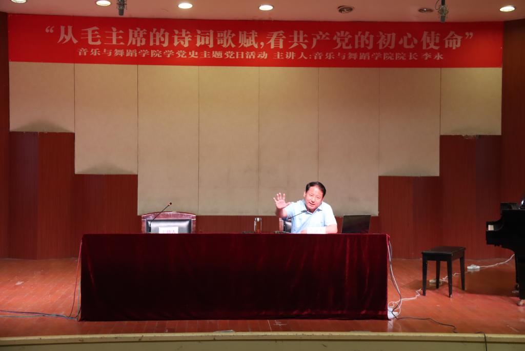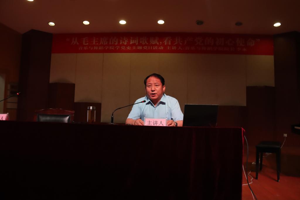 为响应校党委党史学习教育活动的号召,按照校党委的工作部署,2021年5月26日下午,太阳网集团tcy8722党总支在音乐厅开展主题党课讲授活动,授课人为我院院长李永教授,党课讲授题目为《从毛主席诗词歌赋,看共产党初心使命》,我院全体师生党员、入党积极分子、党外人士,全体学生干部二百余人参加了本次党课,党课由党总支书记高原同志主持。