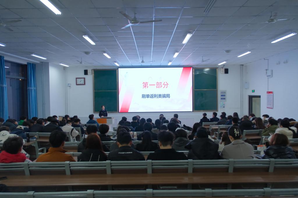 宣讲首先邀请薛城区公安分局反诈中心民警邵议萱、廖梓萌以“反诈防骗,青春同行”为题做反诈骗宣传,进一步加强大学生防诈骗意识,预防校园诈骗事件的发生,两位民警重点介绍了刷单类骗局、冒充身份类骗局、校园贷骗局以及两卡类骗局四类骗局。通过讲解,我院学生深刻认识到诈骗行为的危害性,时刻提高警惕,加强防范意识,远离诈骗陷阱,保护好自身财产安全。