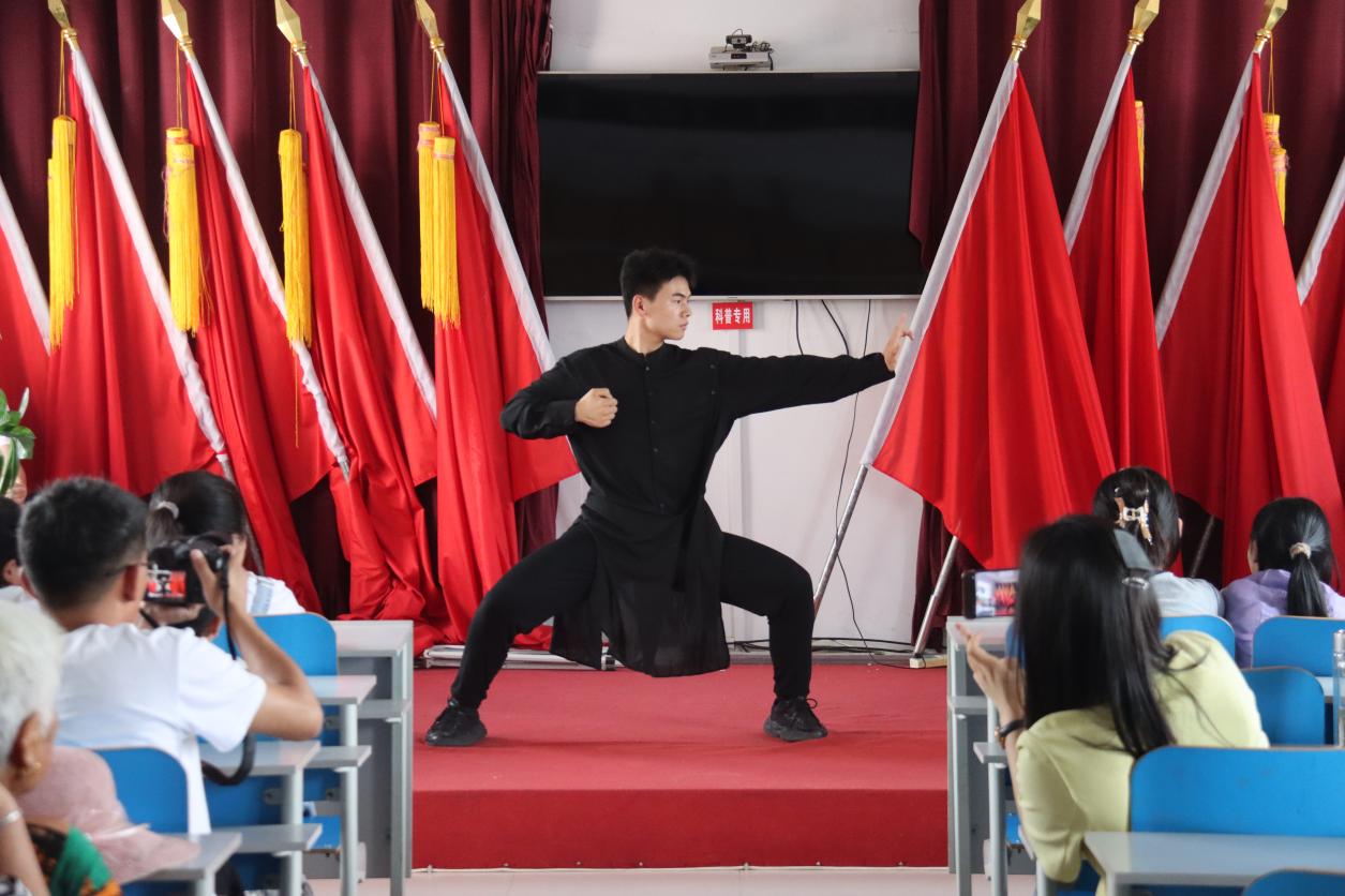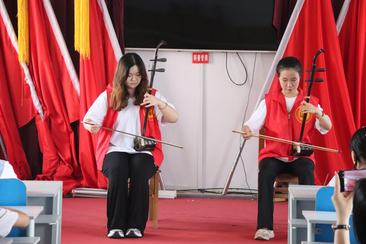 揭牌仪式后我院“红石榴”志愿服务队为村民们带来了精彩的演出。美声独奏《祖国慈祥的母亲》唱出了中华儿女对祖国母亲的无比热爱;男生合唱《上春山》歌唱出了祖国的大好河山表达了对春天的期盼和对生活的热爱;笛子独奏《扬鞭催马运粮忙》描绘了丰收后农民喜气洋洋的样子;柳琴独奏《剑器》让大家感受到了武侠气势和刚柔并济的美感;二胡二重奏《赛马》表现了蒙古族人民的顽强、勇敢的精神和对美好生活的向往;美声独唱《定风波》唱出了一种豁达洒脱无畏风雨乐观面对人生起伏的精神境界;民乐合奏《大鱼》展现了生命的辽阔以及成长的蜕变;美声独唱《驼铃》唱出了战友之间深厚的情谊和离别时的不舍与牵挂;这一系列深情的歌曲演唱、激昂的乐器演奏,余音绕梁,不绝于耳。群舞《石榴花开》展现了两代灯艺人的艺术人生、精神风貌;群舞《次仁拉索》表现出了藏族风情、欢快热情以及劳动与生活;太极表演《天下安河桥》展现出了太极气韵和精神内涵以及中华上下五千年优秀传统文化。小合唱《弹起我心爱的土琵琶》唱出了革命先烈的英勇和顽强。台下的村民们时而陶醉其中,时而随着节奏鼓掌喝彩,现场气氛热烈。