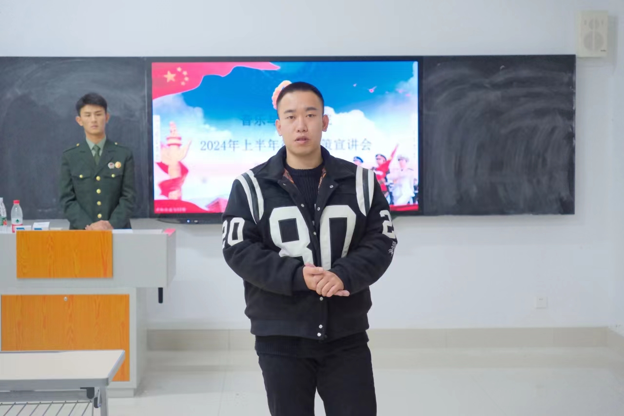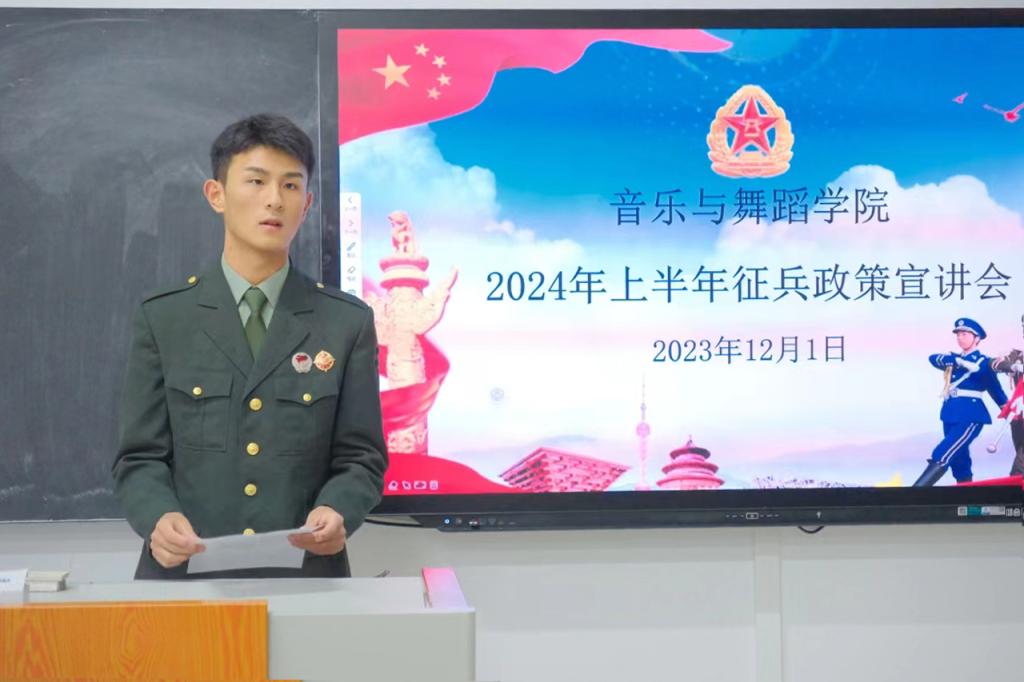 为做好我院国防教育工作并加强征兵政策宣传,进一步贯彻落实国家大学生征兵入伍政策,激发大学生参军入伍热情,鼓励和引导在校大学生积极参与应征入伍,太阳网集团tcy8722于12月1日晚在徳艺楼7108教室举办“2024年上半年征兵政策宣讲会”。此次活动邀请了我院优秀退役士兵周宇宸、杜炳政为此次活动宣讲,各班有意向入伍的同学参与。