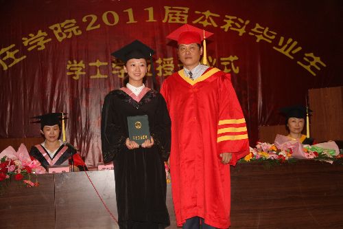 随后,在欢快的乐曲声中,身穿学士学位服的同学们依次按序上台行礼接受学位授予,身着校长导师服的曾宪明副校长为毕业生们拨正流苏并颁发了学位证书,并与他们合影留念,记录下这具有历史意义的一刻。毕业典礼暨学位授予仪式在《毕业歌》中圆满结束。