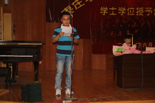 毕业生学生代表孙刚进行了发言。他在发言中向母校承诺,一定会承担起社会赋予的责任,不辜负母校期望和家长嘱托,在工作岗位上建功立业,争做祖国栋梁。 郑晓丹老师代表全体教师进行了发言。对获得学士学位的全体同学表示祝贺,并向同学们提出殷切的期望。在校生代表王振华也进行了发言,表达了对师哥师姐的祝福,并表示一定认真锻炼专业技能,争取在学习和演出中取得更好的成绩。