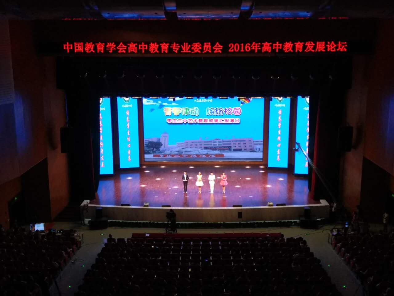 2016年9月23日,中国教育学会高中教育专业委员会2016年高中教育发展论坛在枣庄市实验高中举行。来自全国的教育专家学者和全国重点高中校长就“核心素养与高中教育的变革”这一主题进行了探讨和交流。国家教育咨询委员会委员、国家总督学顾问、联合国教科文组织协会世界联合会名誉主席陶西平,国家督学、中国教育学会副会长、教育部课程改革专家工作委员会副主任、浙江省教育学会会长张绪培,全国政协常委、中国教育学会高中教育专业委员会理事长、北京四中校长刘长铭,枣庄市政协副主席、枣庄市委党校党委书记杨建国,枣庄市教育局副局长冯仰军,山东省高级中学协会副会长、青岛二中校长孙先亮,枣庄市第三中学校长于卫东,枣庄市第三中学党委书记韩建超及来自中国教育学会高中教育专业委员会、全国中学教育工作者等参加了本次活动。论坛结束后是我院承担的大型文艺演出。舞蹈《乘着知识的翅膀》表达了学生对知识的渴求紧扣论坛主题,舞蹈《举杯吧,朋友》唱出了我们对远道而来的专家学者的热烈欢迎,气势磅礴的大型交响乐演奏将整场晚会推向了高潮。得到了与会专家的称赞。
