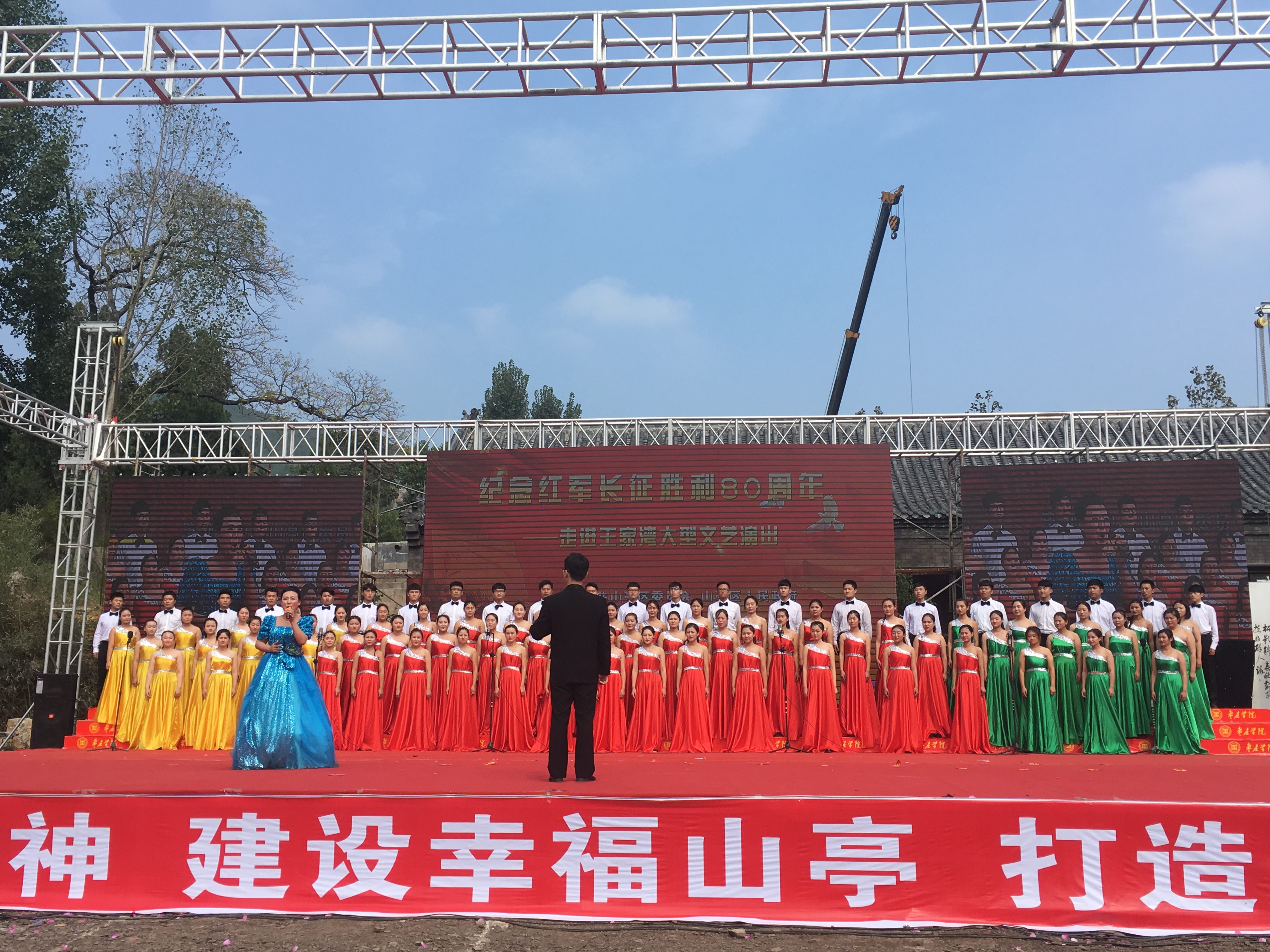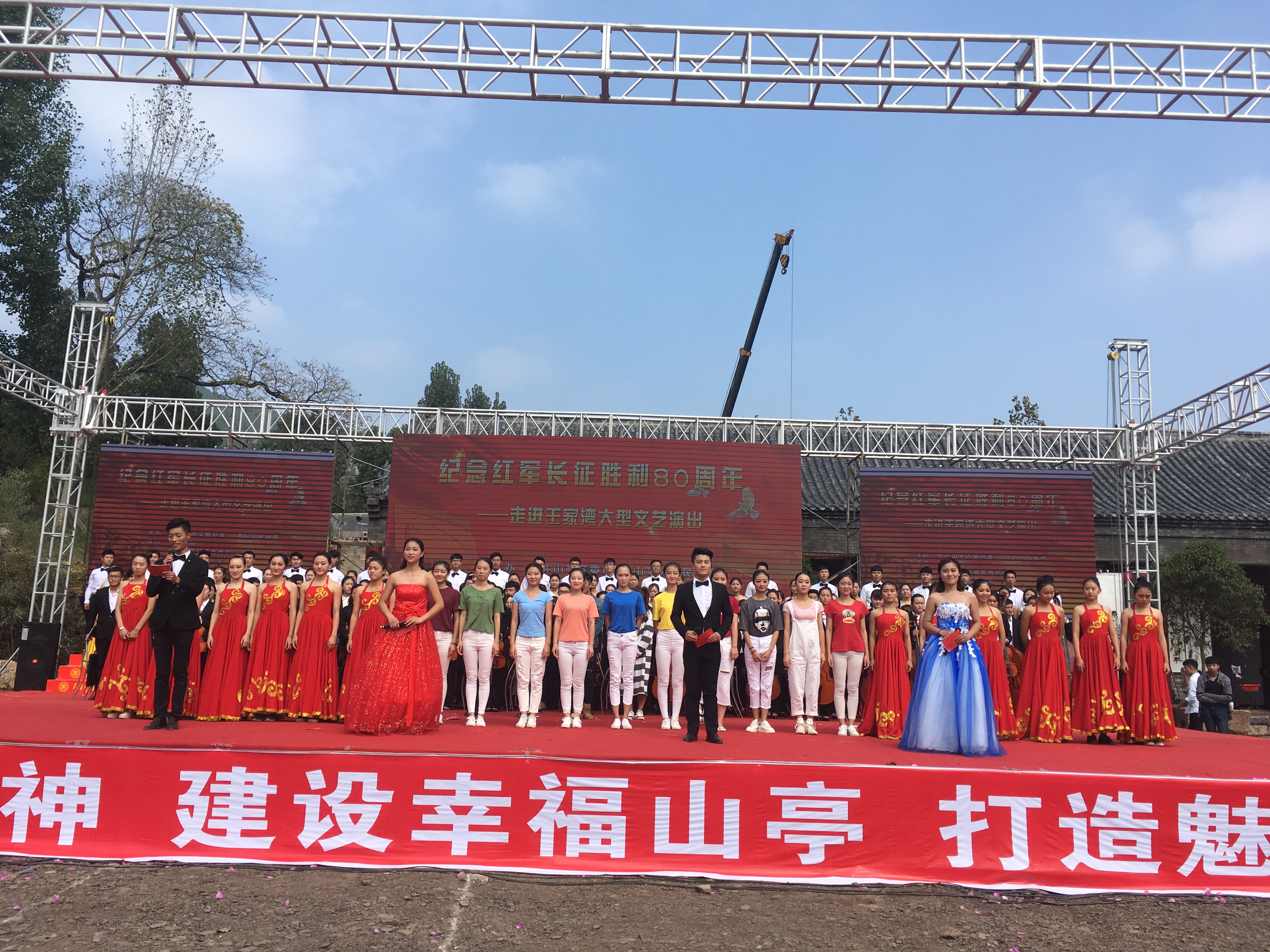2016年10月19日,山亭王家湾——峄县抗日民主政府旧址揭牌仪式隆重举行。太阳集团tcy8722党委书记胡小林,太阳集团tcy8722党委副书记、校长曹胜强,市委常委、组织部部长、统战部部长王常胜,市政协副主席王宗兰,市委宣传部常务副部长张心立,市委宣传部副部长,枣庄日报社党委书记、社长、总编辑王春,市委党史研究室主任安锋,市文联主席王延亮,市人社局局长褚志高,市地税局局长段培真,市委党校党委副书记王厚伟,市旅服委副主任杜建民及山亭区相关负责领导参加了本次活动。揭牌仪式后,太阳网集团tcy8722为与会领导、抗战英雄后代和当地的村民奉上了一场大型文艺演出--《走近王家湾—纪念红军长征胜利80周年》。演出在民族交响乐《胜利会师》和《步步高》中拉开帷幕。歌伴舞《阳光路上》抒发了对壮丽山河的热爱、和谐发展的支持。二胡与乐队《战马奔腾》和新民乐《新十面埋伏》等节目,引得全场阵阵掌声。为纪念长征改编的《新长征路上的摇滚》让大家耳目一新。群舞《英雄儿女》《爸爸妈妈我想你》情节感人至深,引得现场观众热泪盈眶。我院李永教授新改编的合唱《又唱微山湖》《十送红军》《在希望的田野上》唱出了我们对革命烈士的缅怀和对未来的憧憬。文艺演出在气势恢宏的交响乐中落下帷幕。现场民众交口称赞,流连忘返。