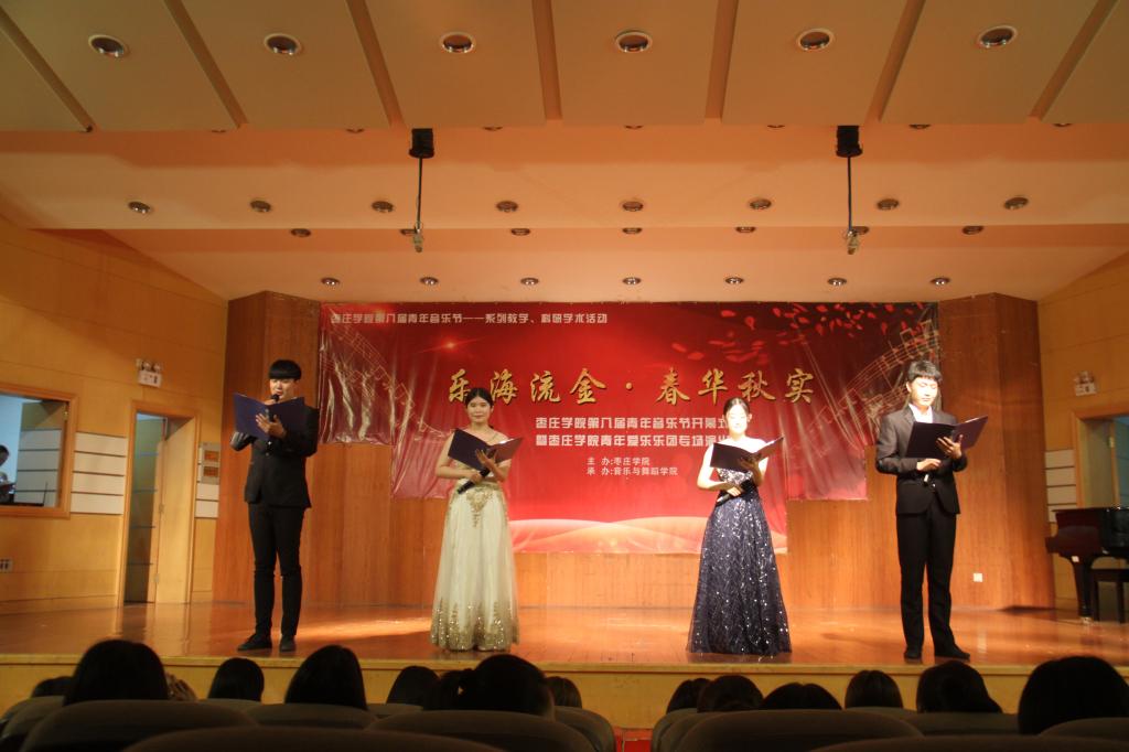15点30分准时进行演出。播音戏剧团的诗朗诵《青春中国》,述说一个大写的中国,他们的声音铿锵有力,展现了当代青年积极向上的精神风貌,让我们在自豪里迸发无尽的激情。流行乐团的演唱《我爱你中国》让我们感受到祖国的万里山河,感受到祖国的魅力震撼,场下的喝彩声不绝于耳,大家的热情亦越烧越旺,场上场下完全融为一体,声浪、人浪融合,置身其中,将整场晚会推向高潮。合唱团的《菊花台》《大江东去》歌声优美,合唱整齐,同学们将观众带到了那回忆的时光。此次演出还增加了民族室内乐团和交响室内乐团;民族室内乐团《欢乐歌》在“山东省音乐家协会第四届青少年艺术展演”民乐组组合类一等奖,交响室内乐团《瑶族舞曲》的演奏使人有一种身临其境的感觉,欢快明亮。