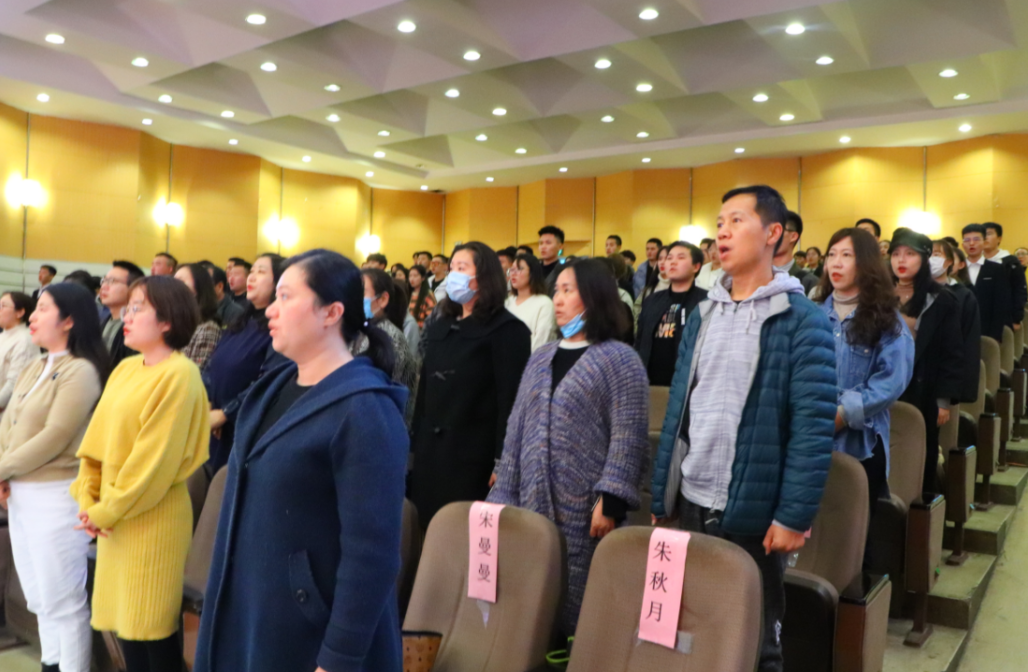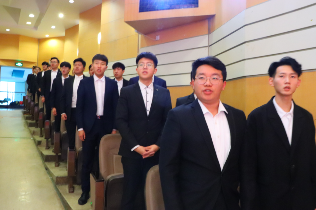 大会在雄壮的国歌声中拉开帷幕,全体师生高唱国歌,歌声激荡,响彻全场。副书记华莹宣读了新一届学生干部名单。领导老师为新任学生干部颁发聘书,握手嘱托并合影留念。在全体师生的监誓下,新任学生会艺术团(青年爱乐乐团)主席兼总团团长贾骐带领2020届学生干部宣誓,誓言铿锵有力,将大会推向高潮。
