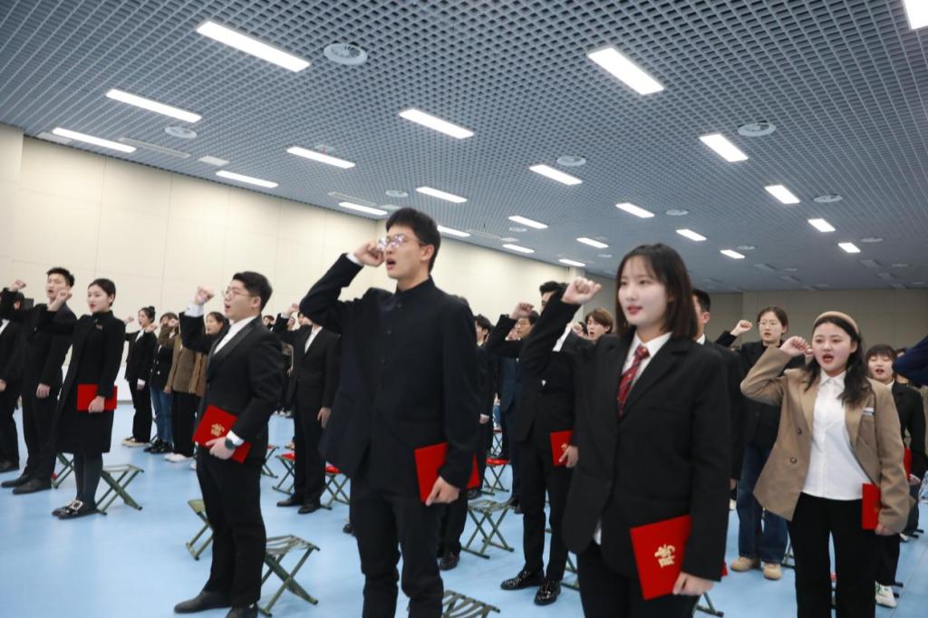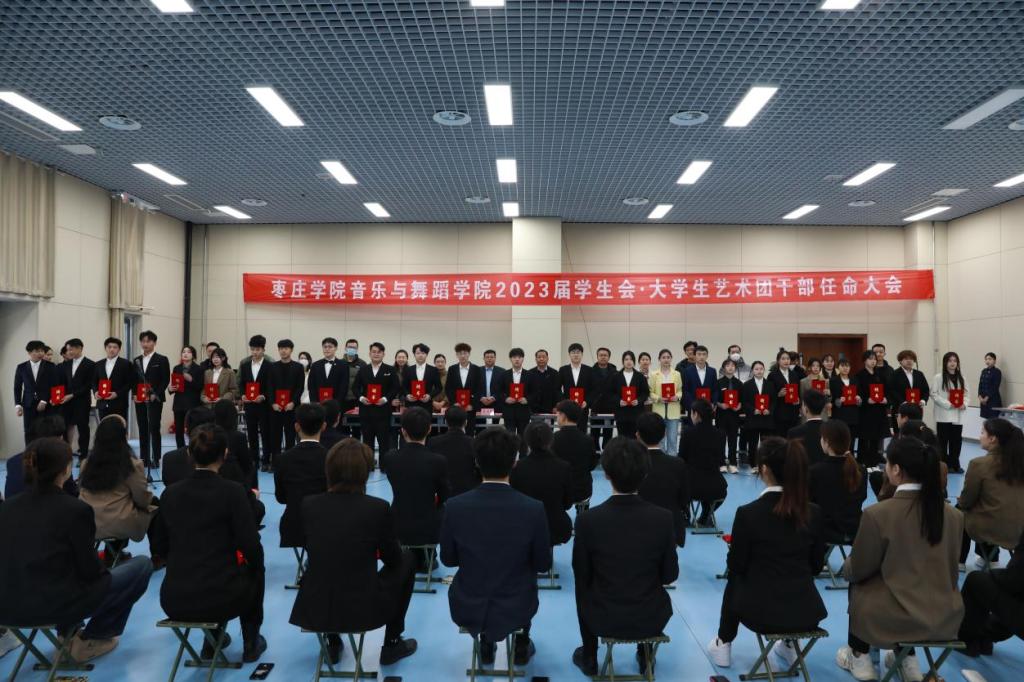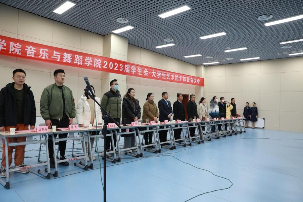 在嘹亮的国歌声中,换届任命大会拉开了序幕,团总支书记刘丹丹郑重宣布了60位学生干部的任命。领导老师为新任学生干部颁发聘书,亲切握手嘱托并合影留念。新任学生会·大学生艺术团主席兼团长朱方晓带领2023届学生干部宣誓,誓言整齐划一、铿锵有力,将任命大会推向高潮。