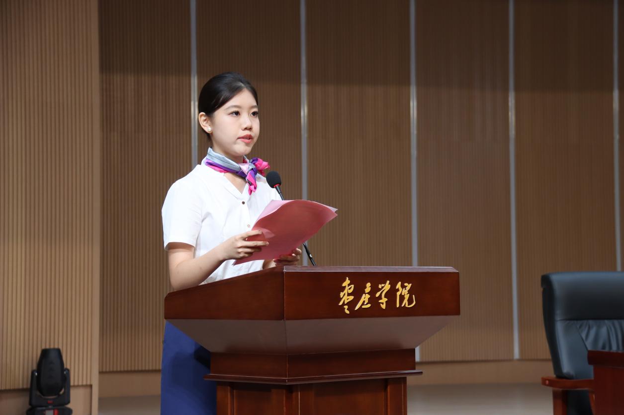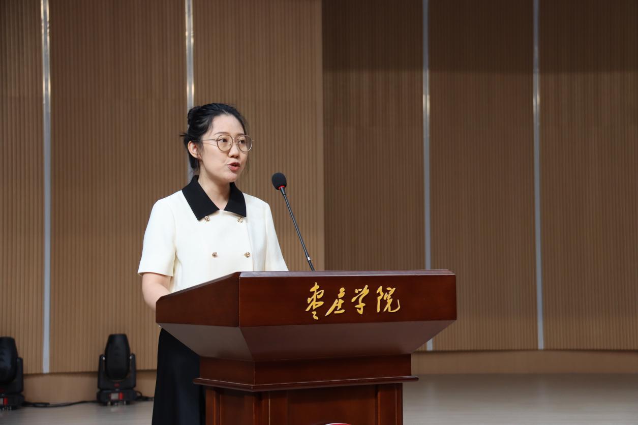 在校生代表王琪同学讲到大学是新起点,要提升品德修养,传承校风校训。珍惜时光,坚守艺术理想,成长为品德高尚的音舞人,为枣院和音舞添光彩,祝愿同学们奋发向上,实现理想。