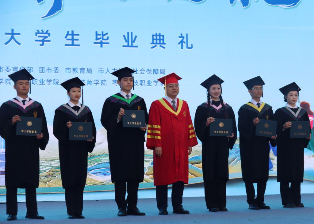 毕业典礼上气氛热烈而庄重,高峰书记为我校6位优秀毕业生代表拨穗正冠、颁发学士学位证书并合影留念。从海林校长以视频寄语为毕业生送上真挚祝福。